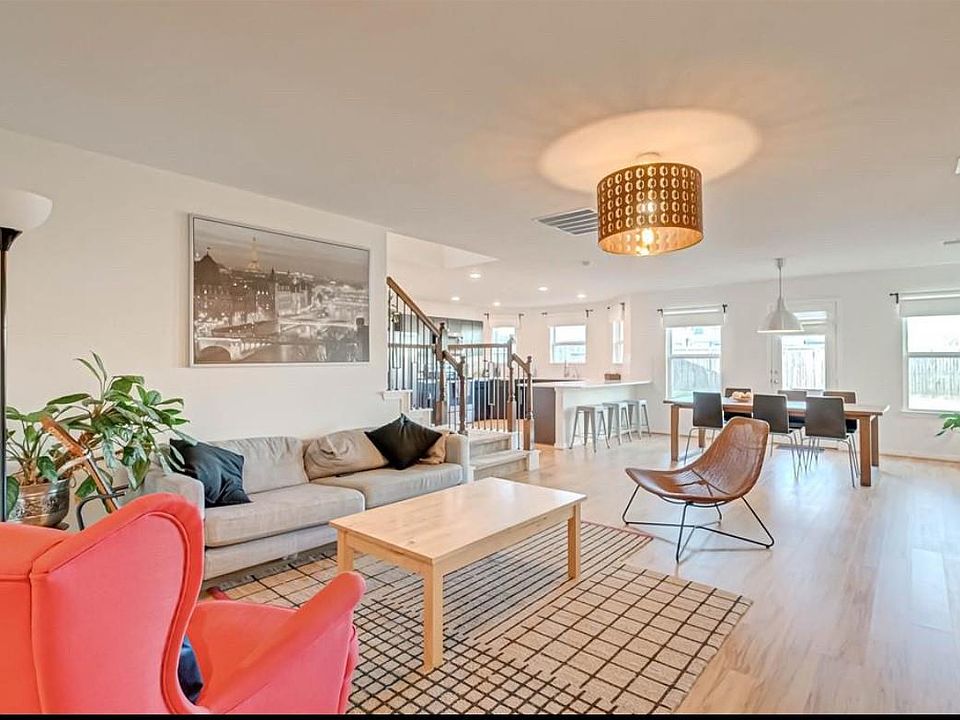 Modern light fixturesElegant and modern upgradesPlush carpetWalls of windowsLarge backyardEngineered wood floorsWhite quartz countertops