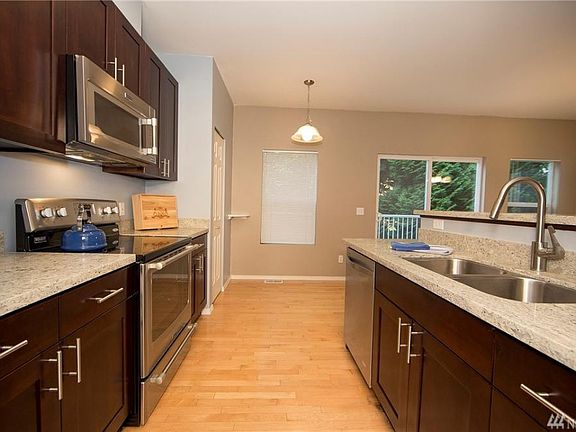 Meticulous 3BR/2.5BA end-unit backing to greenbelt in desirable Cambridge condos. Move-in ready with new paint & carpet throughout. Updated chef's kitchen with new cabinets, granite counters and stainless appliances. Both upstairs bathrooms have new vanities, counters and flooring. Oversized two-car garage with tons of extra storage space. Large living room with cozy gas fireplace. New hot water tank in 2015. Convenient location with easy freeway access. Northshore SD. Must see!
