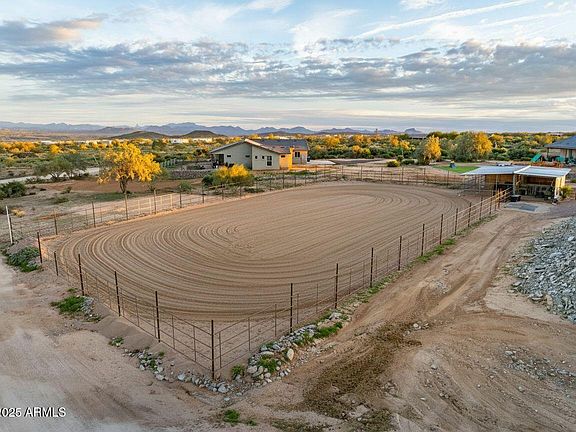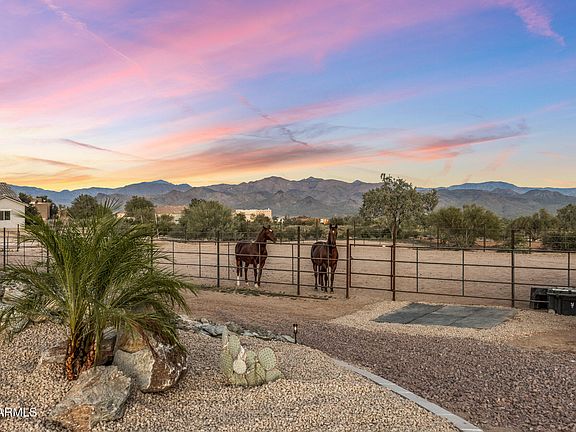 Located in the Rio Verde Foothills with stunning mountain views, this custom 2024 home features an open split floor plan and a beautifully designed kitchen with a large island overlooking the great room and backyard. All four bedrooms are ensuite, offering comfort for family or guests. Tall ceilings and expansive windows fill the home with natural light and frame the desert landscape. Enjoy indoor/outdoor living on the covered patio with views of your horses. The horse setup includes a mare motel with two 20' x 20' stalls plus two 12' x 20' spaces for hay, tack or storage opening directly to a professionally laser leveled turnout/arena. Close to trails and outdoor recreation, this home captures true desert living and no HOA.