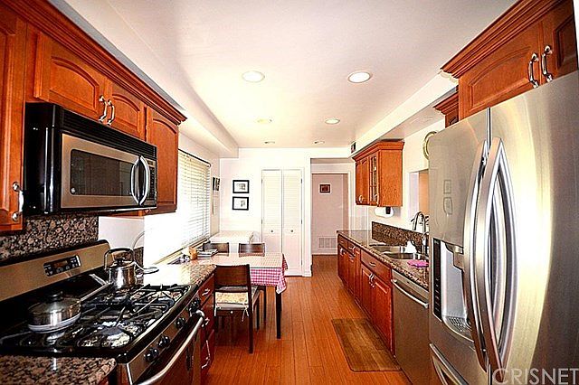 Beautiful pool home in Granada Hills. This wonderful property features almost 1400 sq ft of upgraded interior appointments sitting on an 8300 square foot lot. This 3 bedroom, 1 ¾ bath home is located on a tree lined street. The entire neighborhood boasts pride of ownership. The property has been painted inside and out within the past year and the extensive use of brick and brick ribbons in the front of the property and driveway adds to the curb appeal. A warm gas fireplace is located in the living room. The home has been upgraded with dual pane windows, copper plumbing and central A/C. The home features wood laminate flooring throughout and both bathrooms feature beautiful tiles. There is direct access from the 2 car garage into the hallway leading to the kitchen. The beautiful kitchen was remodeled and features granite counter tops, newer stainless steel appliances and recessed lighting. The backyard is an entertainer's delight with a wonderful pool, a screened in covered patio, many fruit bearing trees and automated sprinklers. Don't miss this one.