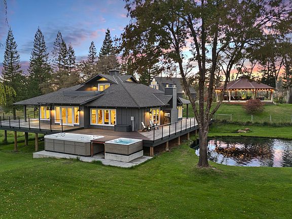 A park you get to call home set on 8.17 +/- sun-dappled acres of lawns, ponds, and meadows! Inside, the open concept invites you to linger beneath exposed beams while abundant windows frame tree-lined views. A generous kitchen and island with granite counters make cooking a pleasure and naturally draw friends and family together. The main-level primary suite opens to the wraparound deck and features a soaking tub positioned for relaxing end or start of your day. Upstairs, a cozy loft with a bath and a private balcony serves as a bright bedroom for guests. Outside, wander meadow paths and streamside nooks, slip into the swim spa or hot tub, then gather in the lighted gazebo for game nights around the firepit and built-in griddle. Above the garage, find an additional 773+/- SQFT of living space or a separate office set-up, including a bathroom. Practical comforts include owned solar, updated paint and flooring, gated entry, and 9.75 Miners Inch of NID irrigation water. With easy access to I-80 and nearby Rollins Lake, this home balances privacy, charm, and everyday livability.