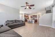 - Ceiling Fan(s), Eating Space In Kitchen, High Ceilings, Kitchen/Family Room Combo, PrimaryBedroom Upstairs, Solid Wood Cabinets, Stone Counters, Thermostat, Walk-In Closet(s)