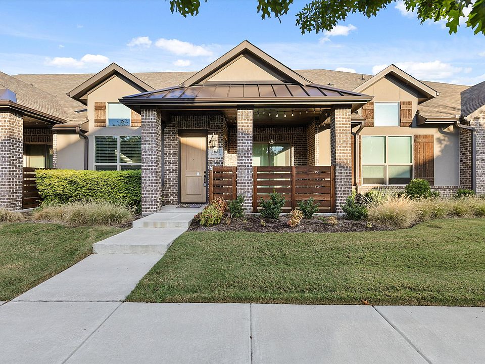 WOW! Like new center townhome in a newer neighborhood. 2 bedrooms, 2 full baths plus a 2 car garage. AND it is a 1 story! Enter the large living area in front, with Primary bedroom off the entry. Second bedroom is split in back. Covered, shaded patio in front, great for afternoons outside, and visiting. Open kitchen is spacious, loads of 42 inch cabinets, Granite counters, subway tile backsplash, too. Amenity center opens to green spaces, pool, clubhouse, Dog Park and trails. This home is Santorini plan, quality-built by Grenadier Homes. This one has it all. Grey cabinet in den will stay, refrigerator will stay.