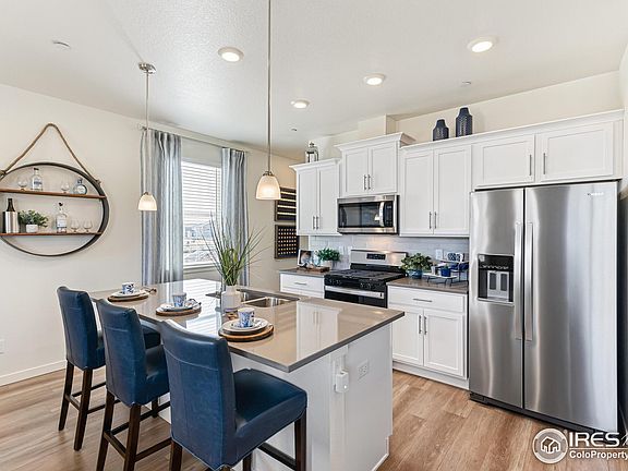 The Vail is a two-story floor plan offered in the Paired Homes at Hansen Farm in Fort Collins with no Metro District! The 1,684 square foot home features 4 bedrooms, 2.5 bathrooms, and a 2-car garage. Aiming to impress the Vail floor plan welcomes you in from the front covered porch to the open concept living area. As you enter into the heart of the home you will see the stunning kitchen that features premium cabinetry, stainless-steel appliances, and an expansive eat-in island that flows seamlessly into both the living room and dining area. The spacious living room is perfect for relaxing or entertaining and provides ample space for any set-up. A powder room is tucked away but still convenient for guests to use. The large primary bedroom is located upstairs and is complemented with two spacious walk-in closets and an en-suite bathroom that features a dual vanity and walk-in shower. You'll also find three additional bedrooms with plenty of space and plush carpets. A laundry room and second bathroom that also includes a double vanity sink are centrally located upstairs providing optimal functionality. ***Estimated Delivery Date: July. Photos are representative and not of actual property***