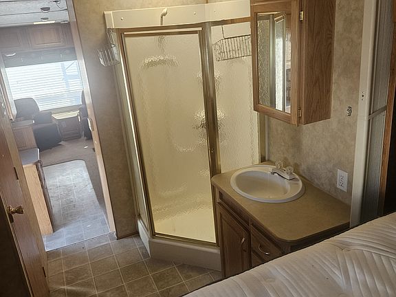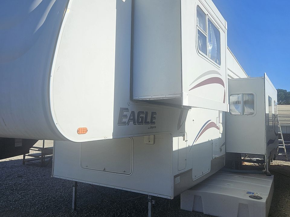 Eagle 27 Ft. Travel trailer with complete set up of dining, living room, shower, bathroom, bedroom, kitchen, AC