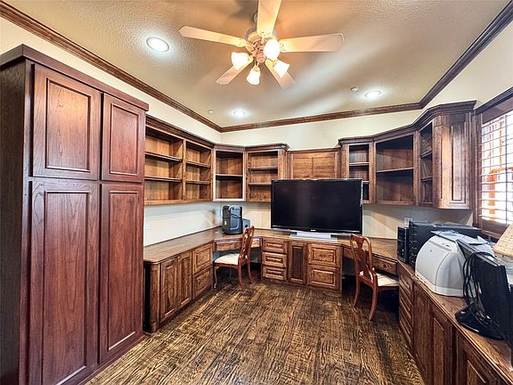 This incredible 8100+ sq ft custom home is a must-see! Step through the front door into a grand foyer, oversized study, and formal living and dining area that will take your breath away. With two main levels and an upper mechanical room HVAC, the entry level boasts a primary suite, three additional bedrooms, three full baths, one half bath, and a utility room. The lower level features a family room, kitchen, theater room, and one bedroom suite. The U-shaped design wraps around a stunning pool and hot tub area. The back of the home offers a picturesque golf course view with a covered deck and grill area. The home features newly renovated wood flooring throughout most of the space, granite countertops in all wet areas, and exquisite woodwork that must be seen to be believed. With countless upgrades, including a highly efficient HVAC system located in the mechanical room, metal ducting double-wrapped for commercial-grade quality, and a fully sprinkled fire protection system, this home is ready for its new owners!