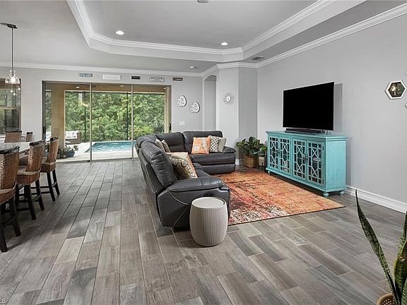 One look will do. Feels like new with an impeccably maintained Ashbury floor plan. Plenty of space for everyone in this 4-bedroom, 3-full-bath and 1-half-pool-bath home. Great room floor plan with a beautiful custom saltwater pool with sun shelf & spillover fountain equipped with LED lighting, perfect for year-round fun and relaxation. Best location with no neighbor to one side, southern exposure overlooking your tranquil nature views. Features include tile in all living areas, custom light fixtures, crown molding, granite countertops, premium ivory travertine pool deck with large picture screens, coffered ceilings, front-entry brick pavered patio and plantation shutters. Saltwater custom pool features LED/bubbler, aqua pebble finish with Aqua Cal Heat Pump, all neutral colors and backgrounds make this home easy to personalize. This West of 75 North Naples location is premium for quick access to shopping, new Oakes Market, Vanderbilt Beach, schools, and life's essentials. Barrington Cove is a gated, low-density community with a relaxing lakeside park to exercise or enjoy the peaceful sounds of Mother Nature. 7.4 miles to the beach.