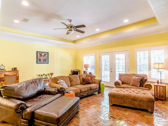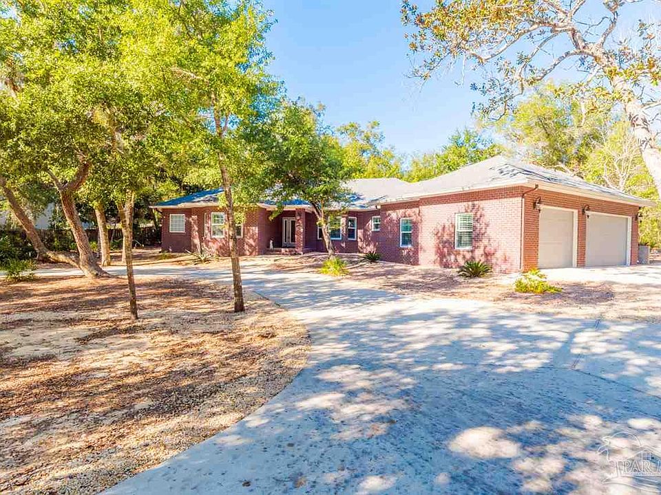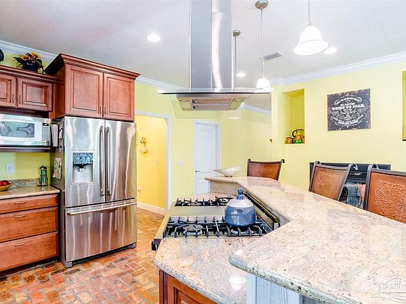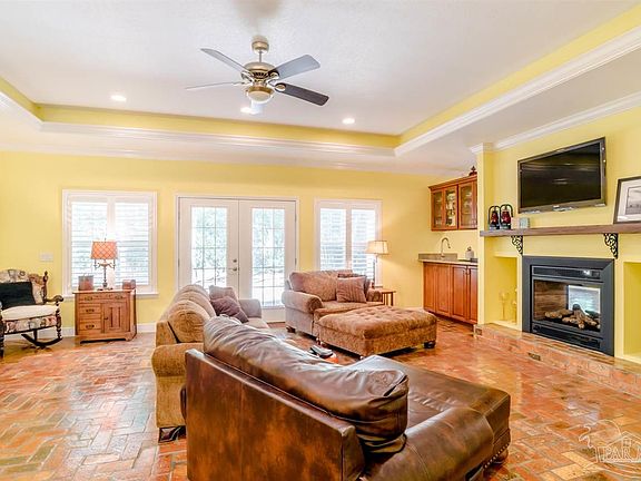 Custom brick home with stately circular drive built on a large lot in the quiet and peaceful gated community of Innerarity Island. No expense was spared both on interior finishes, millwork, and the structure itself (impact glass and doors, spray foam insulation). One enters onto Chicago brick flooring (whole home) with 9' ceilings throughout. Oversized Great room with pass through wet bar and brick raised hearth gas fireplace that flows into the kitchen that includes granite counters, stainless appliances (5 Star gas cooktop with griddle, exhaust hood, two Maytag wall ovens, Bosch dishwasher), walk-in pantry, soft close drawers, breakfast bar, dining area, and exterior French doors to screened covered patio area and further to the fire pit with seating. All the bedrooms have plantation shutters and bay windows. Master has a walk-in closet in the bedroom and the bath, walk-in tiled shower with wall jets and waterfall head (tankless hot water), clawfoot tub, and water closet room. Other well thought out features include an oversized 3+ car garage (almost 1000sqft), large utility/laundry room with deep sink, 12x16 floored attic area, roughed-in outdoor kitchen, and there is an association owned Bay front park.