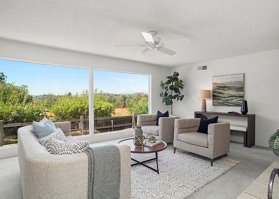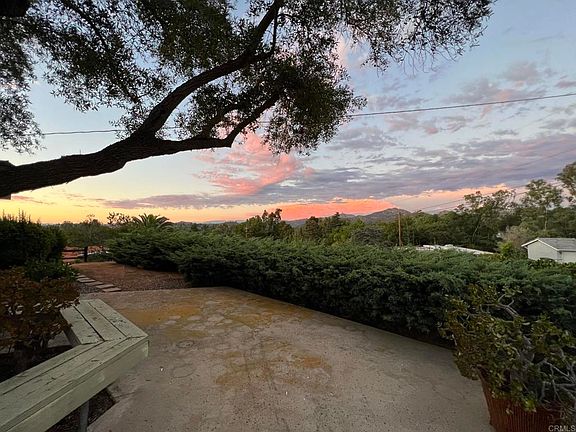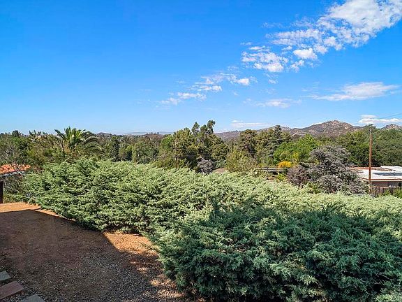Private and peaceful, elevated and mostly flat .52 acre lot with view of Mt. Woodson in the highly desirable Green Valley neighborhood. This single level custom designed Mid-Century ranch style home is in pristine condition surrounded by lush vegetation and mature trees. The split floor plan has a primary suite on one end and secondary bedrooms on the opposite end of the home. The living room has two large picture window which show off the neighborhood and mountain view. The central focal point of the living room is the brick mantle gas fireplace, perfect for cozy gatherings. The dining room also boasts a large picture window showcasing a garden courtyard. The galley kitchen has a pantry, work space desk, extra cabinets and breakfast eating area. The family room is adjacent to the kitchen. Outside the kitchen and family room is a large covered patio for relaxing, enjoying the view and nature and for BBQing. The three bedrooms are spacious and all have double closets. There are many fruit trees on the property including 2 orange, 1 tangerine, 1 grapefruit and 1 avocado tree. The yard is big enough to add a pool, spa ADU and/or RV parking. Niche best schools rates Poway as #2 in the San Diego area.