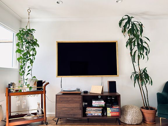 In law: Living room with new Joybird couch, big TV, standup desk, kitchenette with key appliances (micro, hotplate, instantpot), bathroom, bedroom with queen bed. Entry through garage with access to backyard. Perfect for older kids, parents, or as a separate office space.
