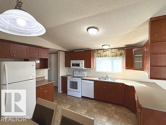 This bright & spacious mobile home is open plan & has a great layout. The kitchen has an abundance of cabinets & decorative tile backsplash, appliances include a new fridge (6 mos.), built-in dishwasher (1 ½ yrs) & built-in microwave. The living room is large with a ceiling fan & the large primary bdrm has an ensuite with a faux glass wall, 2 person jacuzzi tub & a walk-in shower. The 2nd & 3rd bdrms are located on the opposite end of the home near the main 4 pc bthrm. The HWT was replaced in approx. 2015 & the heat tape was replaced in approx. 2019. Washer & Dryer are included. There is a good sized partially fenced yard with one 10’x12’ storage shed & side by side parking. Some upgrades required. Immediate Possession! Don’t wait to view!