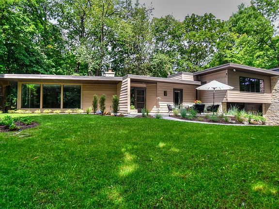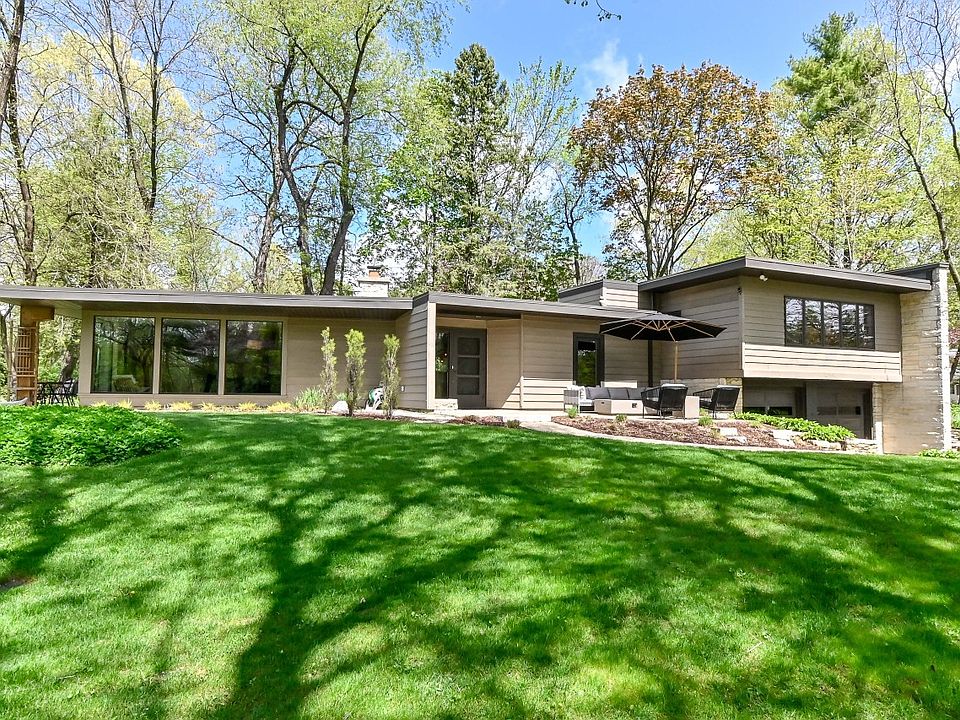 Stunning open concept mid-century modern-designed for today's lifestyle & entertaining. Tranquil & private lot: mature trees & low maintenance gardens. Incredible backdrop to view patios. In a pocket of Elm Grove w/a ''10'' on a scale of walkability-park, restaurants, library, schools-easy walk. Current sellers took out step, added in-floor heating in FR & installed cork flooring in DR & FR to match KIT. Updated KIT: soft close bamboo cabs, gas range, new dishwasher & quartz countertops. Buffet in DR & built-in bar in FR. LR newer windows brings nature inside/gas FP w/new doors/gas starter. MBR: large WIC, '17 carpet. Laundry next to MBR. New windows-upper northeast bedroom & upper bath. '20: roof inspected/resealed, H2O softener, & trees removed/trimmed. '13 Tankless H2O heater & boiler