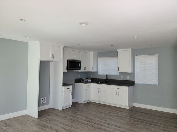 Modern cabinetLaminated wood flooringHigh ceilingsNewer custom kitchen cabinetsWhite quartz countertopsSpacious floor planWindow blinds