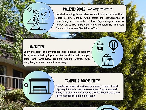 Located at 1635 Martin Drive, Barclay Arms offers one of the most desirable rental locations in the area. With a Walk Score of 87, residents can enjoy the convenience of being steps away from shopping centres, grocery stores, cafes, and restaurants, while also having easy access to numerous parks and green spaces. White Rock Beach is just a 4-minute drive, making weekend getaways and seaside walks part of everyday living. The neighbourhood is safe, vibrant, and well-connected by transit, making it ideal for professionals, families, and anyone who values both comfort and convenience.