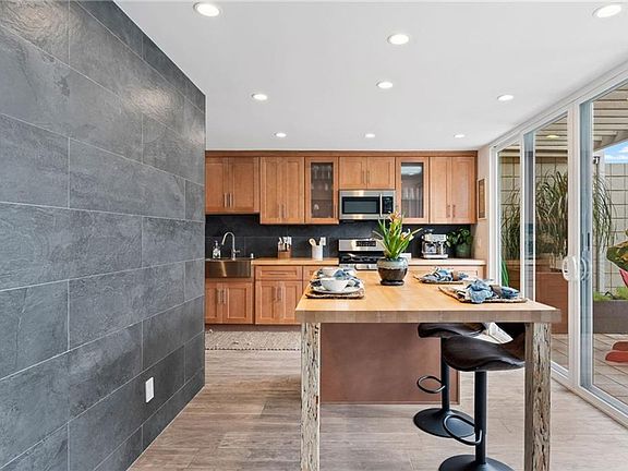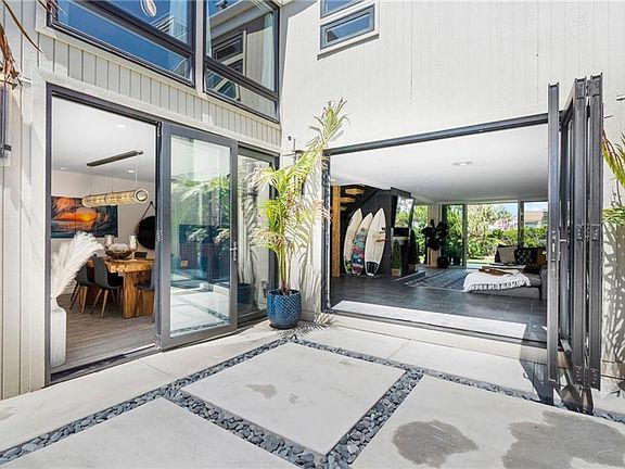 This thoughtfully re-imagined Huntington Harbor townhome epitomizes the pinnacle of contemporary coastal living. The experience begins as you step into the recently hardscaped front courtyard, a tranquil space that foreshadows the luxurious atmosphere within. Dual trifold accordion doors create a seamless blend of indoor and outdoor living, allowing natural light and the refreshing ocean breeze to fill the home.