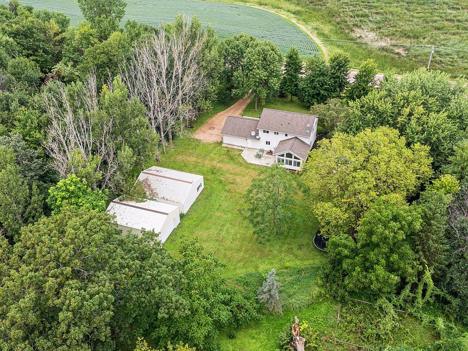 Stunning custom-built two-story on 7.68 mature acres. Large kitchen with new flooring, granite countertops, stainless steel appliances, and oversized dinette with double chandelier.. Main floor family room with raised-hearth, floor-to-ceiling stone fireplace. Formal living room (currently used as guest space), but could be a beautiful home office as well. Convenient ¾ bath on main level and very large full upper bath. Sun-filled four-season porch with transom windows and vaulted ceilings. This will be your favorite place to be. Imagine the Christmas tree in there. Three bedrooms and laundry room on upper level with hand-troweled ceilings throughout. Full basement with room to expand and plenty of storage. Oversized insulated two-car garage with rough-in for heat. Outbuildings: