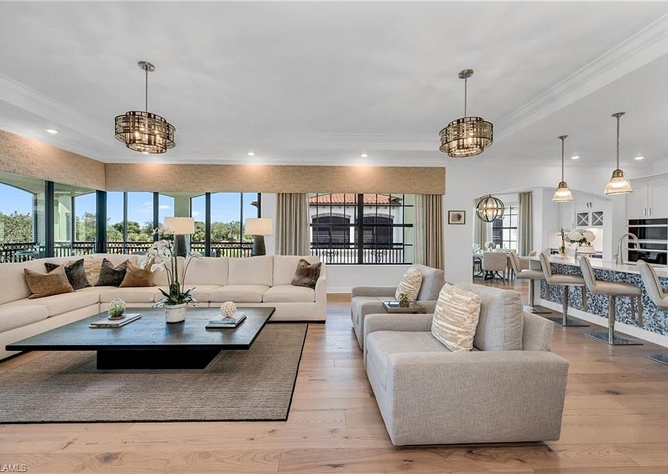 Experience elevated living in this beautifully-appointed Viansa penthouse residence in Talis Park. Built in 2021, this 2,950 square foot residence offers 3 bedrooms plus a den/media room, 3 full baths, and one half bath, all accessible through a private elevator entry that opens into an expansive great room with soaring ceilings, generous millwork and incredible views of the lake and golf course. The gourmet kitchen is a centerpiece of the home, featuring Monogram appliances, extended quartz countertops, a custom tile backsplash, and bespoke wood cabinetry with abundant storage. Just off the kitchen, a dedicated bar area with a double wine cooler and matching quartz surfaces provides the perfect setting for entertaining. The dining and living areas flow seamlessly, enhanced by oak wood flooring, a bespoke built-in media storage, and custom wine cabinetry, opening onto an oversized lanai with northern exposure and spectacular views over the golf course. The primary suite offers generous proportions, a large, custom walk-in closet, and a luxurious bathroom with quartz countertop double vanities, a soaking tub, and a huge, walk-in shower. Two spacious guest suites, each with en-suite baths and oak floors, provide so privacy and comfort, that your guests will not want to leave! A separate office/media room opens to a second screened patio. The laundry room combines practicality and style with custom cabinetry, quartz countertops, a large drop-in sink, and under-cabinet lighting, offering abundant workspace and storage for everyday convenience. Additional highlights include custom Lutron automated shades, smart light switches, and two parking spaces with golf cart space and a secure storage room. Residents of Talis Park enjoy an unparalleled lifestyle defined by its award-winning Vyne House clubhouse, featuring multiple dining venues, a Core Fitness Center, and the Esprit Spa. The community also offers five Har-Tru clay tennis courts, four pickleball courts, bocce courts, a lap pool, resort-style pool, dog parks, a tot lot park, walking and biking paths, and a vibrant lifestyle. A variety of social and wellness programs throughout the year create a vibrant, connected atmosphere that complements the tranquility of Viansa’s golf course setting. Welcome home to Talis Park – where your dream lifestyle awaits.