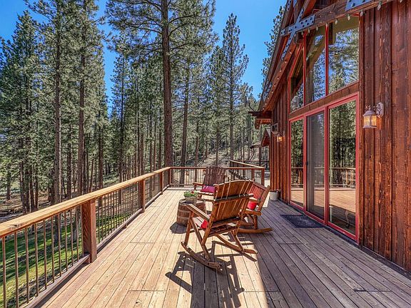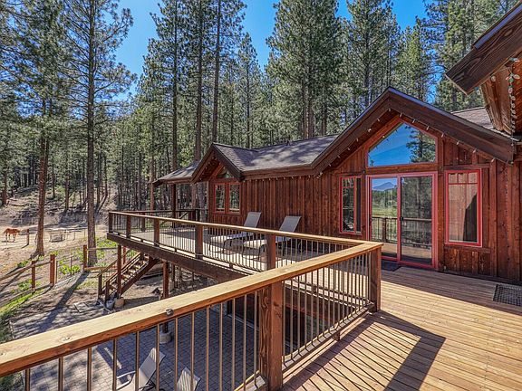 Tucked away on over five private, forested acres in the beautiful Russell Valley, this property captures the best of mountain living with room to spread out, space for animals and recreation, and breathtaking views of Russell Valley, Mt. Rose, and Northstar. Nearby, Boca, Prosser, and Stampede reservoirs offer boating, fishing, and summer fun, while winter brings world-class skiing at Palisades Tahoe, Northstar, and the Donner Summit ski areas just a short drive away. The home has a warm mountain architectural style, with vaulted ceilings in the main living area that create a sense of light and openness. Solid hickory flooring, in-floor hydronic heat, and expansive windows framing the surrounding landscape add to the feeling of comfort and quality. The great room flows seamlessly into the kitchen and dining areas, opening to an extensive wraparound deck with space for entertaining, relaxing, and soaking in the hot tub while taking in the views. Designed for both convenience and flexibility, the layout features three bedrooms, a full hall bath, a laundry room, and the main living areas upstairs. Downstairs includes the attached garage, mudroom, bonus room, gym or office plumbed and wired for a future kitchen, a full bath, and an additional bedroom. A dedicated toy garage offers ample space for boats, RVs, and all the gear that comes with the Tahoe lifestyle. The property also includes a 2,000 square foot, four-horse barn with turnouts and a spacious arena, providing an excellent setup for riding, training, or simply enjoying the open space. A widespread irrigation system keeps the land vibrant, making it equally suited for horses, gardening, landscaping, or other recreational uses. With four bedrooms, three baths, and over five acres, this is more than a home. It is a retreat that combines the quiet beauty of the mountains with quick access to downtown Truckee for dining, shopping, and community.