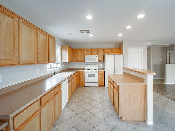 Step into your beautiful 4 bed, 2 bath home located in San Tan Valley! Neutral paint and flooring flow throughout this open-concept floor plan. The kitchen provides all the cabinet space you will need, a large island with a breakfast bar, and sleek white appliances. The master suite's bathroom is split from the room, perfect for extra privacy! Spacious, double sinks, large walk-in closet, and a tub or shower- take your pick! The other 3 bedrooms are all great sizes and provide plenty of storage space.