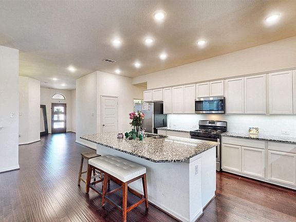 Gorgeous single-story in Gateway Parks with beautiful brick elevation! Inside you will find 4 bedrooms, 3 full baths, formal dining area, and 2-car garage! Upgrades and amenities include rich wood flooring throughout main living areas, open layout plan perfect for entertaining, cozy family room fireplace, split secondary bedrooms for added privacy, neutral paint tones, an abundance of natural lighting throughout, and more! Secondary bedroom located at the front of the home offers an ensuite bath perfect for guests! Gourmet kitchen boasts granite countertops with a subway tile backsplash, bright white cabinetry, stainless appliances, and large island with breakfast bar. Primary bedroom secluded at the rear of the home offers a luxurious bath with dual sink vanity and generously-sized walk-in closet. Fully fenced private backyard! Come see all that Gateway Parks has to offer! Amenity center with a fitness room and event room that hosts a wide array of community events, three community pools, playground, and MORE!