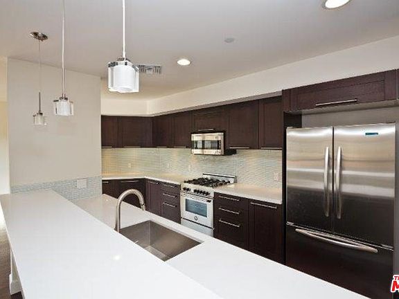 New building built in 2013. 2BD + 2.5BA condominium home is located north of SM Blvd and only about 700 feet from the entrance to the Century City Mall. This unit is about 1,500 SF. It is a front condominium on far right side with 2 master suites. APX 1500 SF. This upscale and elegant condo is on the 4th floor, features recessed lighting, maple plank hardwood floors, full-sized Maytag washer & dryer inside the unit. The kitchen features a stunning Bertazoni stove and high-end stainless steel appliances including a French door refrigerator, kitchen breakfast bar open to living room. Gas fireplace. The bedrooms face west/Beverly Glen.