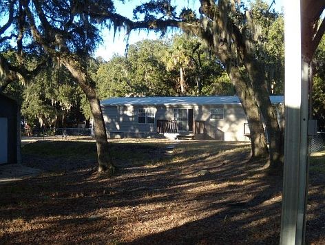Secluded 42 mobile Home with a boat slip located on Black Hammock Island. This large 2176 square foot mobile home has a partially fenced yard, shed, and plenty of space to park a boat or RV. You'll relax under all the shade this beautiful yard has to offer while enjoying the peaceful water in your backyard. This property is so secluded you'll feel like you are on your own island. The master has a very large closet, big bathroom with separate shower and large garden tub. The three other bedrooms and bathroom are on the other side of the home. The kitchen is large with plenty of cabinet space and separate laundry room.