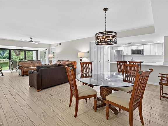 Stylish lighting fixturesLake viewsEnhanced interior finishesContemporary ceiling fansGlass-enclosed lanaiNew glass-front wet barDining and kitchen areas