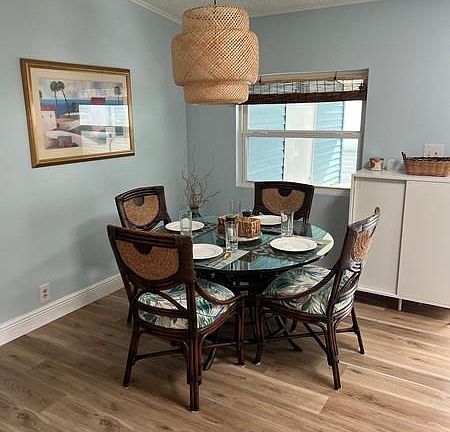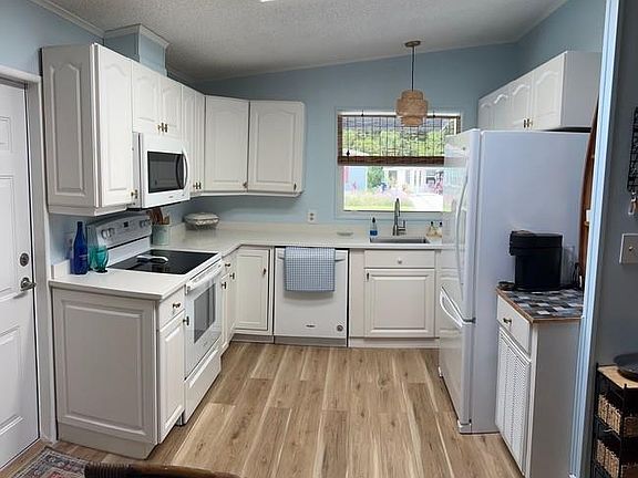 This transformed hοmе іs turnkey fullу furniѕhed with all you need tο movе in and enjoy the Florida sunshine. Newly upgraded kitchen features quartz counter tops. Designer decorated home with completely new painted interior and exterior with high performance Behr paint. striking Vinyl plank flooring throughout. Decorator Lights & fans. Fully renovated master ensuite with premium mattress and new linens. master bath updated. Guest bedroom holds a queen bed with new linens. Home has new impact window and new window coverings. Out side you have new front door according door on shed, designer driveway accented with new landscaping. All new carport extension, newly painted driveway which holds two cars. New screens in lanai. New Metal roof October 2021 and A/C. New heavy skirting vents . This home is waiting for YOU!