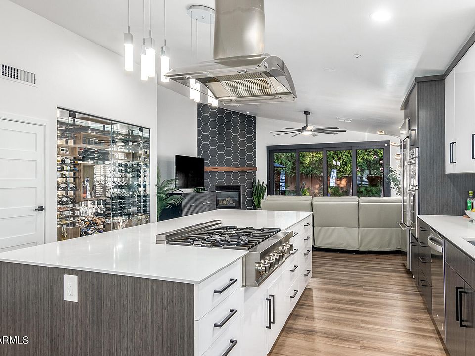 Your beautifully redesigned gourmet kitchen is at the heart of your home, a culinary enthusiast's dream. It features a walk-in pantry, island/breakfast bar, quartz countertops, modern European slab cabinets, tons of storage, a large SS hood, and a 36'' gas cooktop—Marvel at your floor-to-ceiling, glass-enclosed, 400-bottle temperature controlled wine cellar, which adds to the kitchen's functionality. The sleek cabinetry creates cohesion throughout the home, tying each room together with a sophisticated aesthetic.