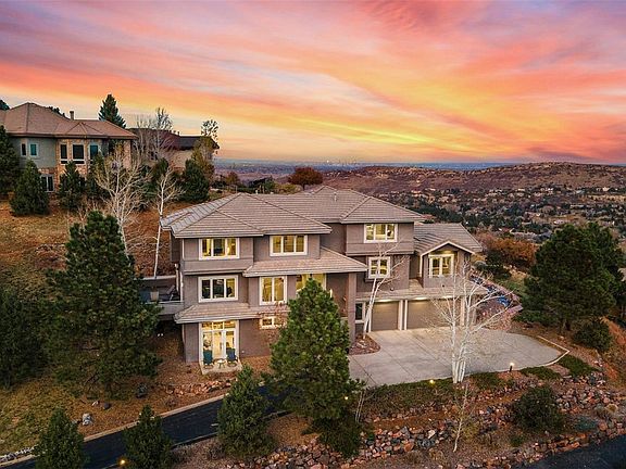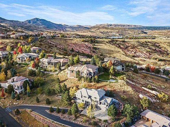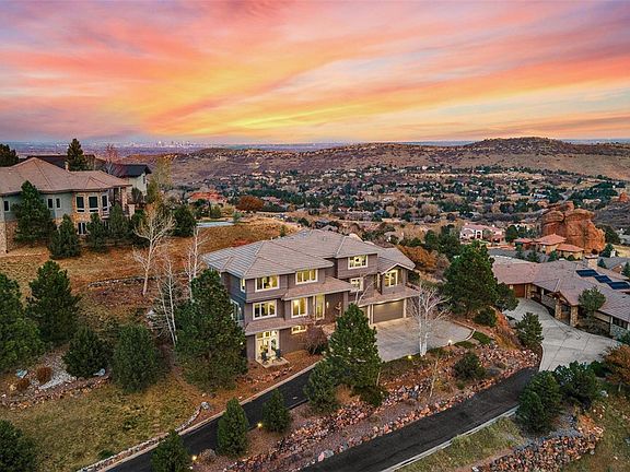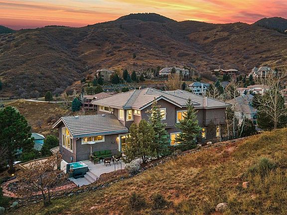 Main level w access to the new west-facing deck, ideal for sunset cocktails. Grey-washed wood floors, sleek gas fireplace, soaring ceilings, powder room, & walls of windows that flood the area with natural light. Dining area flows into updated kitchen w white marble, an island w gas cooktop, SS appliances, modern lighting, & amenities + a handy dumbwaiter for effortless grocery transport from garage. Vaulted ceilings & lg windows frame vistas of the Dakota Ridge hogback, southern valley, and downtown. Step out to the front balcony to savor morning coffee with a view or access the private patio with a hot tub and a tranquil waterfall. The built-in bar area offers an extra beverage fridge.