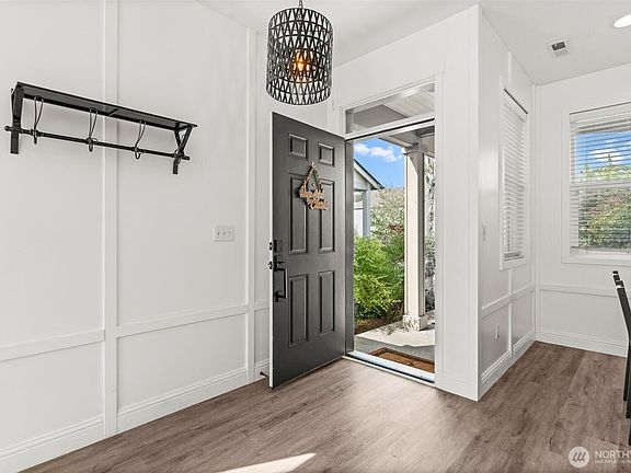 Welcome to the nicest home in the sought-after gated Wyndham Ranch Community! The entry sets the tone with custom designer walls and a statement chandelier. The spacious living room opens to a bright kitchen featuring an island with an overhang great for eating and entertaining. Upstairs, the expansive primary suite boasts LVP flooring, a large walk-in closet, and an en-suite bath. All bedrooms have a walk-in closet. Modern upgrades to the home include new LVP flooring, faux wood blinds, and central AC. Enjoy a fully fenced yard with front and backyard sprinklers. Community amenities include a gated entry, parks, walking trails, courts, common areas, and a covered picnic space—all just minutes from JBLM, shopping, and entertainment!