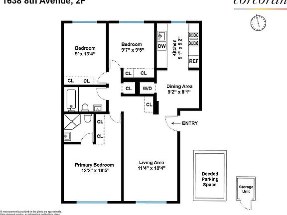 Prepare your favorite meal in the separate kitchen complete with dishwasher, stainless steel appliances, and plenty of counter space. Enjoy those meals with guests in your intimate dining room just off the kitchen. In a city where large spaces are hard to come by apartment 2F provides you, not only, with copious outdoor space but room to spread out indoors, as well. The primary suite boasts a large 12' 6" by 12' 4" footprint as well as a 42 square foot dressing area and ensuite bathroom with frameless glass shower stall. You'll also be bathed in natural sunlight by the primary suite's large South facing windows. In addition to the kitchen and dining room the North wing of the apartment also hosts two additional bedrooms and the second full bath, complete with a wide soaking tub, and a home office space. A stone's throw from the F & G at Prospect Park - 15 St. and the R at Prospect Ave the city is just minutes away. 1638 8th Street is also surrounded by fantastic food and shopping. Being just two blocks from Nighthawk Cinema and, of course, Prospect Park means you'll have something exciting to do no matter the weather, right around the corner from your new home.