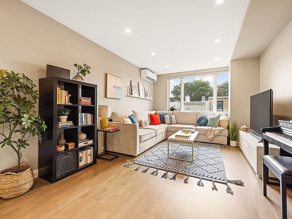 Modern light fixtureShared backyardCommon gardenCommon roof deckLight and airyWide plank hardwood floorsDuctless split system