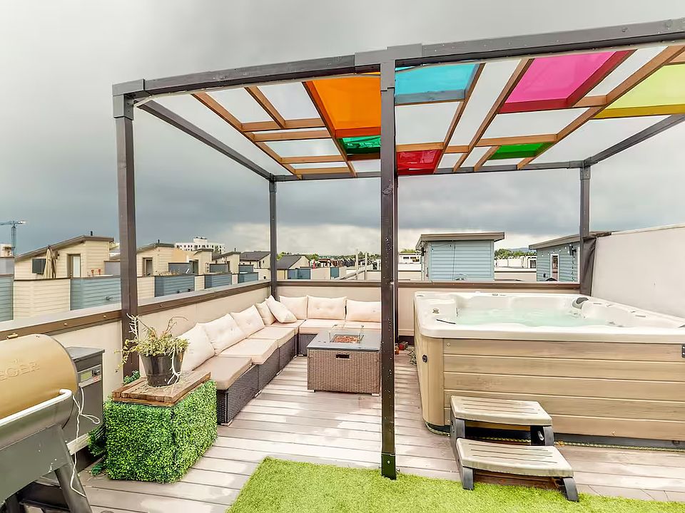 Stylish barHot tubDowntown viewsRooftop patioCurated book collectionArt-inspired designOpen-concept main level