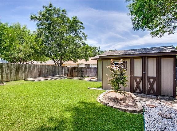 Great curb appeal. Split bedroom floor plan, formal dining and 2 living areas. Front living area with gas log fireplace & crown molding. Kitchen with granite counter tops, tile back splash & updated appliances. Garage conversion has large closet for 4th bedroom or can use as a game room. Master bedroom has sliding doors that lead to the patio. 2 storage buildings & wood fence with steel post. This one is a must see.