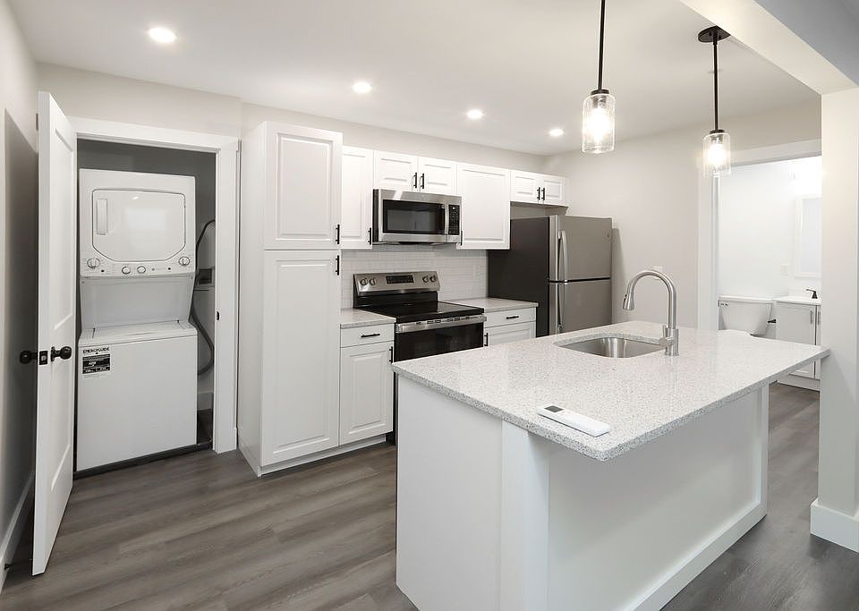Both bedrooms are generously sized with ample closet space, while the bathroom offers a sleek quartz vanity, a large walk-in shower, and the convenience of in-unit laundry. Thoughtful design provides abundant storage throughout the apartment, and off-street parking is included.