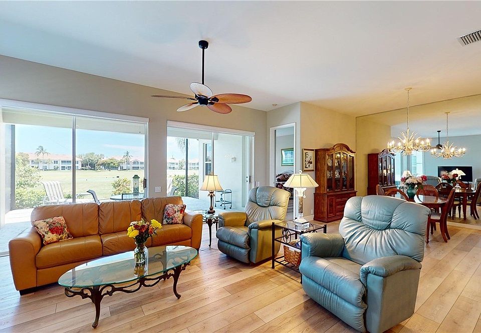 Welcome to Lexington Country Club's Golf Village Villa home (Andover floor plan). This single family 3 bedroom 2 bath home features new Luxury Vinyl Tile floors in the living room, dining room, and primary bedroom. Both bathrooms have been updated along with the kitchen's stainless steel appliances and granite countertop. The tile roof is new as of 2023. The lanai has new pavers and picture window screened cage that looks out to the 11th fairway and pond. Villa is being sold furnished/turnkey. Lexington Country Club is just minutes from the beaches, RSW Airport, shopping, dining, and hospitals! The community consists of an 18-hole championship golf course (bundled in HOA fee), 12 lighted tennis courts, 6 heated swimming pools, a fitness center, tiki bar, beach area, restaurant, and 3 bocce courts. Don’t forget to look at the virtual tour--either play it or click to walk-through each room.