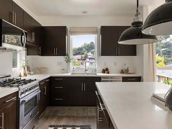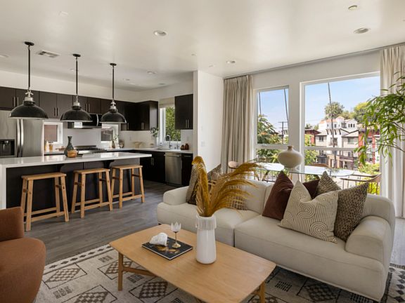 Unfurnished, single family home in the ideal Echo Park location, this modern three-bedroom home delivers elevated design and a massive rooftop deck with stunning vistas. Tucked at the end of a gated community, the residence feels exceptionally private. The expansive layout has seamless flow connecting living, dining, and a stylish kitchen outfitted with quartz-style counters, stainless appliances, and a center island. Large windows bring in the sunlight and frame verdant vistas; hard surface floors run throughout, including marble in all bathrooms. All three bedrooms are ensuite, offering flexibility for guests or work. The downstairs suite opens to a private garden, beautifully landscaped with climbing roses and an olive tree. With a custom shade system, the scenic rooftop deck becomes a year-round extension of your living space, a tranquil setting for entertaining and unwinding. Amenities include central AC, laundry, and a two-car garage with EV hookup. A gated pathway directly leads you to Echo Park Ave. where you will find Bacetti, Cookbook, Tilda, Canyon Coffee, and more.