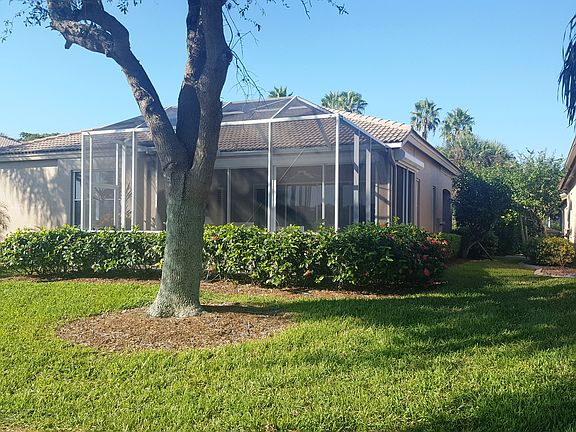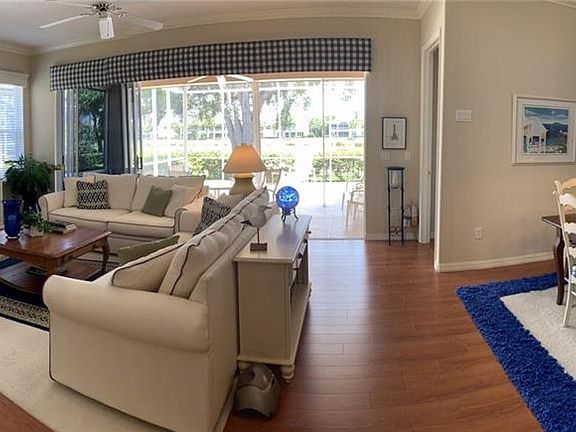 3 bed/2 bath Single family villa "Andover II" w 2 car garage overlooking the 12th fairway! Home features 2013 laminate flooring throughout, tile in kitchen and baths, crown molding in kitchen, living and dining rooms, and custom mirrored dining wall! Home has a 2018 hot water heater and a 2015 A/C! Bedroom/ den has a built in desk w cabinets and storage! Master bedroom and bath feature plantation shutters and a newer comfort height toilet! Electric shutters on freshly painted extended lanai and manual shutters on windows! New tiles and sealing replaced on the roof in 2016- sellers had a 2019 roof inspection all showing in good condition! Newer 5 year old golf cart w 2015 batteries included in purchase! Furniture is negotiable! Golf membership, annual fees apply.