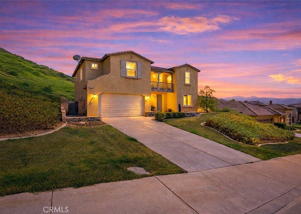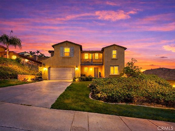 Welcome to luxury mountaintop living in the exclusive Lake Hills Reserve community! This designer-updated 5-bedroom, 4-bathroom residence offers resort-style living with a highly desirable layout featuring a full bedroom and bathroom on the first level, ideal for guests or multi-generational living. The main living areas boast soaring ceilings, while the gourmet kitchen showcases a center island, walk-in pantry, and ample storage. On the second floor, the private primary suite is separated from the other generously sized bedrooms and includes a retreat area, balcony with panoramic views, spa-inspired bath with soaking tub and walk-in shower, elegant quartz and marble finishes, and his-and-hers closets. The entertainer's backyard is beautifully designed with a Bogner saltwater pool and spa, built-in BBQ, and dual fire pits, perfect for both entertaining and everyday enjoyment. An extra-long driveway and tandem garage complete this exceptional home. Enjoy walking distance to Lake Hills Elementary School and HOA amenities including a private residents' club with pool, playground, and open-air fireplace, plus hiking trails, stunning sunsets, and mountaintop serenity—all while being conveniently close to Riverside's amenities. A must-see home that truly needs to be experienced in person to appreciate.
