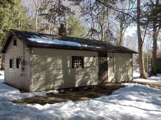 Cozy cottage offers a great room with knotty pine walls, built-in gun cabinet and gas fireplace. Cabin can sleep 6 people comfortably. Furnished. 3 sides have vinyl siding and the front has wood. Composting toilet in outhouse/shed. Walk to hunt across the lane.