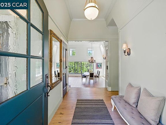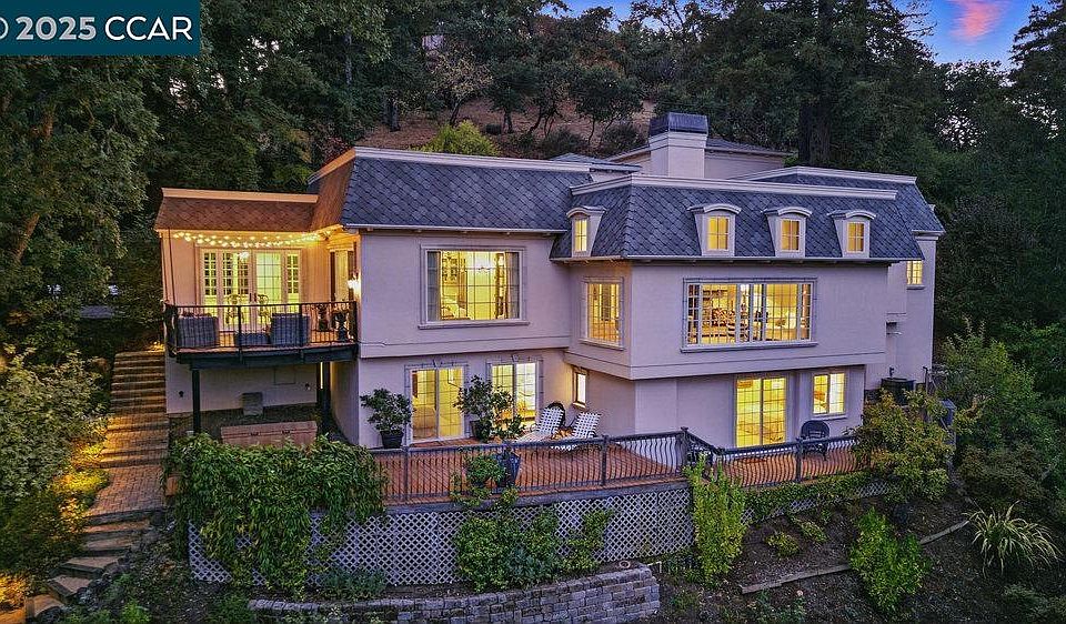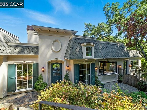 Perched above the 5th Fairway of Orinda Country Club, this stunning French Country home offers sweeping views of the golf course and oak-studded hills. Renovated in 2016, it features soaring ceilings, dormer windows, and walls of glass that fill the home with light and seamlessly blend indoor and outdoor living. The state-of-the-art eat-in kitchen boasts Carrera marble counters, custom cabinetry, a large island, pantry, and charming breakfast room, all opening to a spacious family room and expansive deck. The grand living room is anchored by a dramatic stone fireplace and flows to the elegant dining area, perfect for entertaining. The serene primary suite includes a private office, luxurious bath, and cedar-lined walk-in closet. Downstairs offers three additional bedrooms, one en suite, an updated bath, and a flexible bonus area. With European white oak floors, new roof, beautifully landscaped yard, gas fire pit, and timeless architectural details, this home is a rare Orinda gem. All this charm in a fantastic centrally located location - moments from down town Orinda, Orinda Country Club and all k-12 years of top rated schools. Welcome Home!