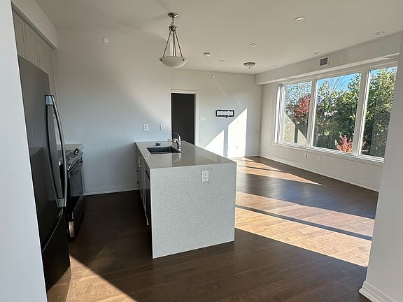 Enjoy peaceful views of trees, and forest stretching from every window in this bright and thoughtfully designed 3rd-floor apartment. The open-concept living room and kitchen create a spacious, airy feel, featuring quartz countertops, a center island, and stainless steel appliances. Just off the kitchen, a cozy dining nook provides a perfect space for meals without intruding on the main living area. Tinted windows throughout offer both energy efficiency and enhanced privacy. This compact space lives large with smart design and modern finishes. Additional features include in-suite laundry, elevator access, exclusive use of one parking space, and access to a shared rooftop patio ideal for relaxing or entertaining with a view. With a location close to all amenities - groceries, banking, restaurants and more are just steps away!