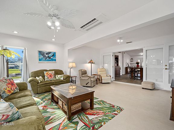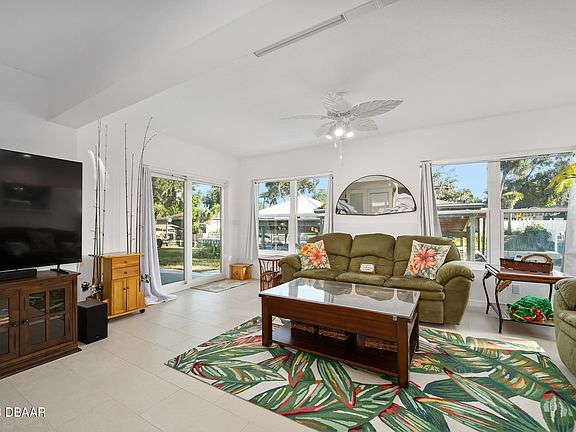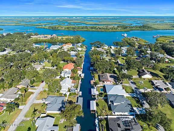 Waterfront opportunity on a quiet cul-de-sac in one of Edgewater's most desirable neighborhoods. Custom built high above the water in 2001 of solid concrete block, this 3 bedroom, 2 bath home features vaulted ceilings and an open floorplan with plenty of natural light. The split floorplan offers 2 privet guest rooms on one side and a large master bedroom on the other with walk in closet, luxurious bath with garden tub and an extra sitting area overlooking the water. The main living and dining areas are separated from the kitchen by a gas fireplace. In 2021 the owners added a lovely family room in the back of the house to create a large area to entertain and relax. At this time the entire roof was replaced. A boaters dream come true, the dock was constructed in 2021 to high standards with stainless fastenings and marine grade materials to accommodate two vessels. A vertical seawall is in place. New irrigation system. 2 car garage with additional storage and an access door to a sidewalk that allows easy transport of fishing and boating gear down to the dock. This unique location gives the fisherman in the family direct access to the Indian River and it's incredibly rich estuaries with healthy stocks of oysters, crabs, snook, trout, tarpon and redfish. The leisurely boater can take in the natural sights of neighboring Canaveral National Seashore or stop into the many waterfront bars and restaurants in Ponce Inlet and the News Smyrna Beach waterfront, just a short cruise to the south.