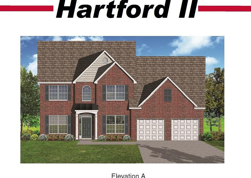 The Hartford II, Elevation A, on a walk out basement, by Ball Homes is one of the largest first floor master suite homes. A transom and sidelights surround the front door welcoming you into the open floor plan. The formal living and dining rooms are perfect for entertaining and the large 2 story family room with abundant windows, fireplace & bookcases adds great appeal. The kitchen includes an island, variable height cabinets, granite countertops, under cabinet lights, butler's pantry, stainless appliances including a French door refrigerator, and breakfast area with a bay window. The first floor luxurious master suite features a bay window and the master bath has a fully tiled corner shower, and 2 vanities with quartz countertops. A drop zone has been added for organization and the first floor utility room with folding area is handy. 3 bedrooms, full bath and large bonus room complete the 2nd floor. All bathroom mirror has been deleted. Lot 68FL