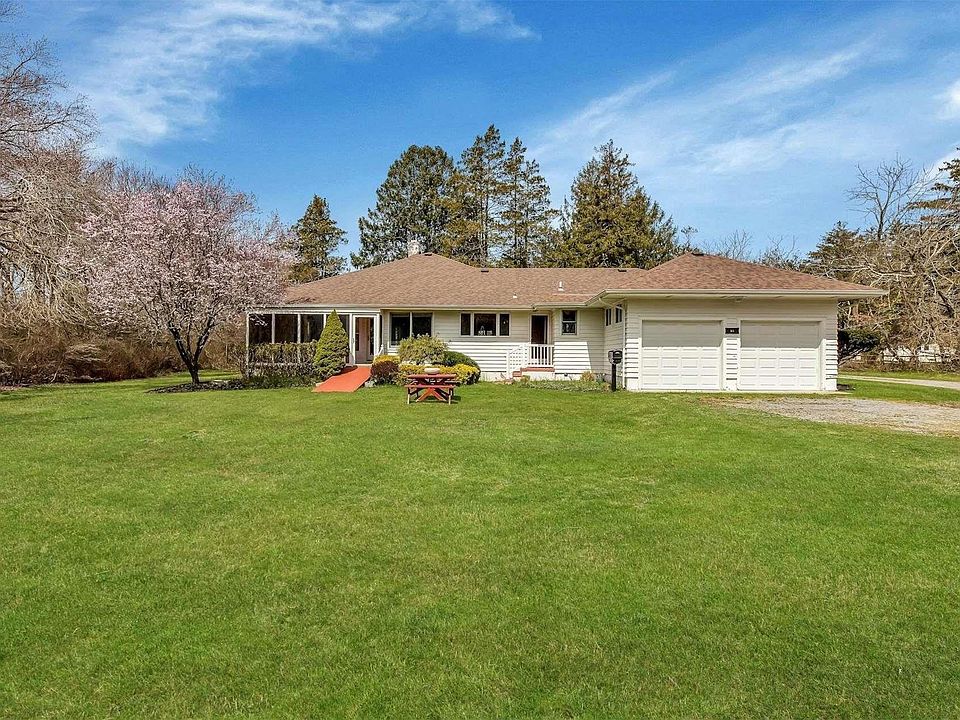 Almost 3 acres in South Blue Point! If you love privacy and natural surroundings, you'll adore this rare find. This Midcentury-Modern Ranch, characterized by large glass windows and open space, featuring simplicity and an integration with nature is just delightful. The long tree lined winding driveway opens to the tucked away home and lots of green space. The cover front porch welcomes you inside to the entry foyer with double closet, hardwood floors, front to back living room with wood burning fireplace, home office, and rear screened sunroom. An updated modern kitchen is the center of the home. Three generously sized bedrooms, inclusive of the primary suite with full bathroom, a full guest bathroom and attached 2-car garage complete the home. Don't miss this one!, Additional information: Appearance:Very Good,Separate Hotwater Heater:yes