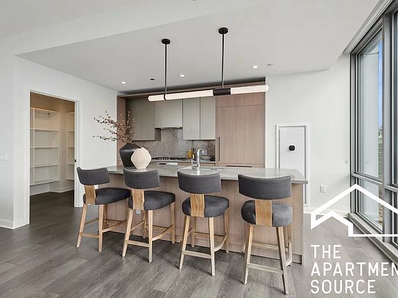 Come home to an incredible 1,658 square foot three bedroom, two bathroom, plus powder room residence situated in the southeast corner of the building. This home features a spacious kitchen complete with back-painted glass upper cabinetry, Bosch and Fisher Paykel integrated appliances plus beverage center by Thermador, and three centimeter quartz countertops with full height backsplash. Kitchen opens to a large living area with room for dining. Enjoy 9'6" soaring ceilings, roller shades, wide plank flooring throughout, spacious customized closets, and dual sinks in the ensuite primary bathroom.