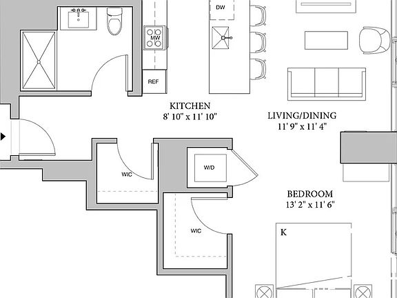 This convertible, one bathroom residence offers beautiful east facing views. An open kitchen and living space is complete with back-painted glass upper cabinetry, Bosch and Fisher Paykel integrated appliances, and three centimeter quartz countertops with full height backsplash. Enjoy soaring 9'6" ceilings, roller shades, wide plank flooring throughout and spacious customized closets.
