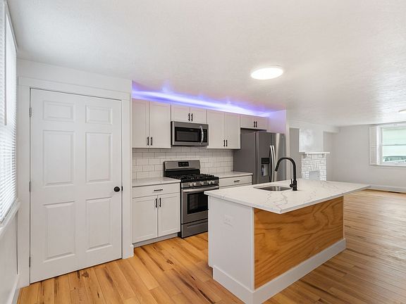 New kitchen with stainless steel appliances, new cabinets, island, quartz countertops