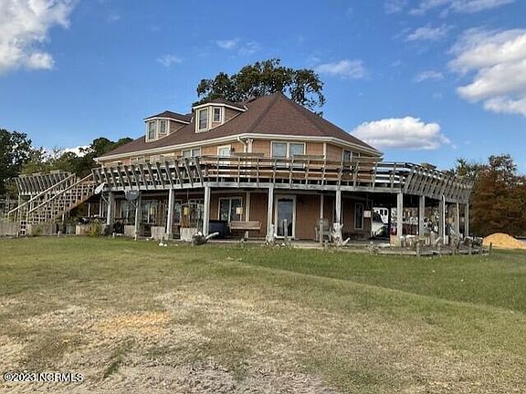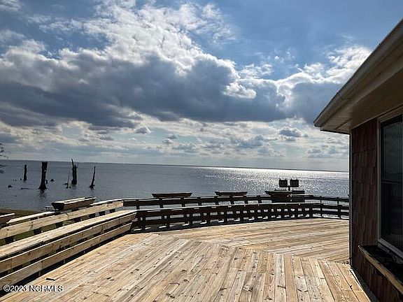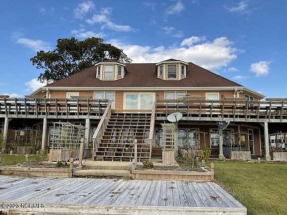 Magnificent sunrises and sunsets will be your experience if you owned this wonderful, large, 4 bedroom, 3.5 bath, 2.5 story contemporary home with a full wrap around deck, with seating, to take in the beautiful sound views and wildlife that can be found in abundance like Martin's, Doves, and Osprey. With 514' of sound and canal waterfront footage you will never want to leave your porch. Huge detached garage and carport encompassing 1,693 square feet will ensure plenty of storage space for your water toys. 1st floor offers a small kitchenette with sink, living space, a full bath and utility room which houses 3 air to water heat pumps that run off of well water. 2nd floor has kitchen, LR, full bath and 3 bedrooms with a split floor plan. Nice sized master with en-suit and two closets. 3rd floor is a huge space with 682' of living space and 1/2 bath. Rare find with so much sound and canal front footage. 6'' walls and insulation throughout. Skylights are finished on the inside but roof would need to be cut open and skylights installed to complete.
